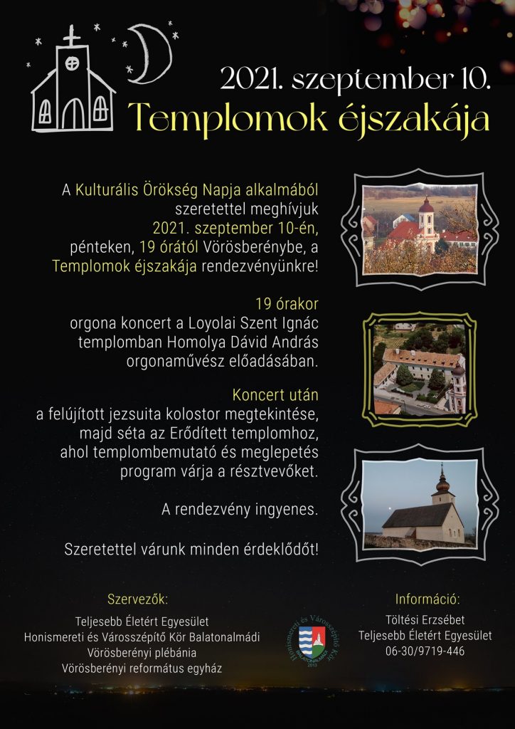 Koncert és történelmi séta is szerepel a Templomok éjszakája balatonalmádi programjában. A Honismereti és Városszépítő Kör Balatonalmádi szeptember 10-én szervezi meg a Templomok éjszakája elnevezésű programját szeptember 10-én, 19 órától. A Kulturális Örökség Napja alkalmából tartandó esemény Vörösberényben a Loyolai Szent Ignác templomban 19 órakor kezdődik, ekkor Homolya Dávid András orgonaművész ad koncertet. Az előadást […]