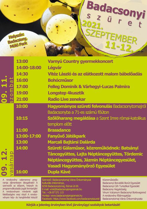 Szeptember 11-12-én rendezik a Badacsonyi Szüret hagyományos programsorozatát a badacsonyi Móló Parkban. Szeptember 11-én, szombaton 13 órától a Varnyú Country zenekar ad gyermekkoncertet, légvár, Vitéz László, és bohócműsor szerepel a kicsiknek szóló programok között. 17 órakor fellép Felleg Dominik és Várhegyi Lucas Palmira, majd a Longstep 4kusztik, és a Radio Live zenekar zárja a napot. […]