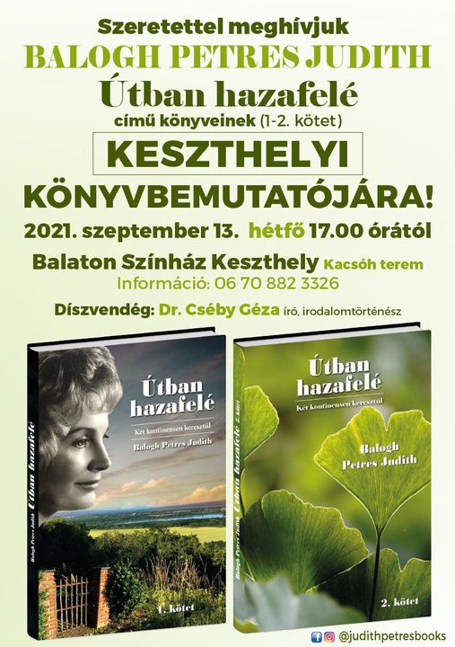 Balogh Petres Judith Keszthelyen bemutatja az Útban hazafelé című könyve 1. és 2. kötetét szeptember 13-án a Balaton Színház Kacsóh termében 17 órától.