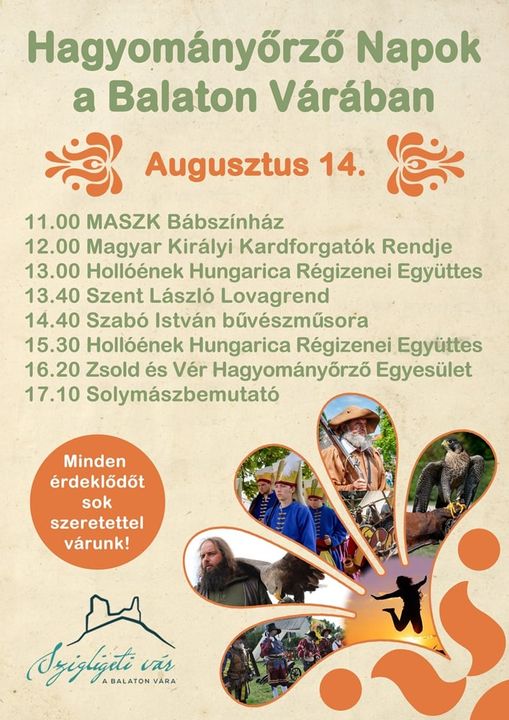 Szigligeten, a Balaton várában Hagyományőrző napokat rendeznek augusztus 14-én. Délelőtt a Maszk bábszínház lép fel, délben a Magyar Királyi Kardforgatók Rendje várja a vendégeket, aztán a Hollóének Hungarica Régizene Együttes játszik, bemutatkozik a Szent László Lovagrend, Szabó István bűvészkedik, a Zsold és Vér Hagyományőrző Egyesület tart bemutatót és a solymász élettel ismerkedhetnek az érdeklődők.