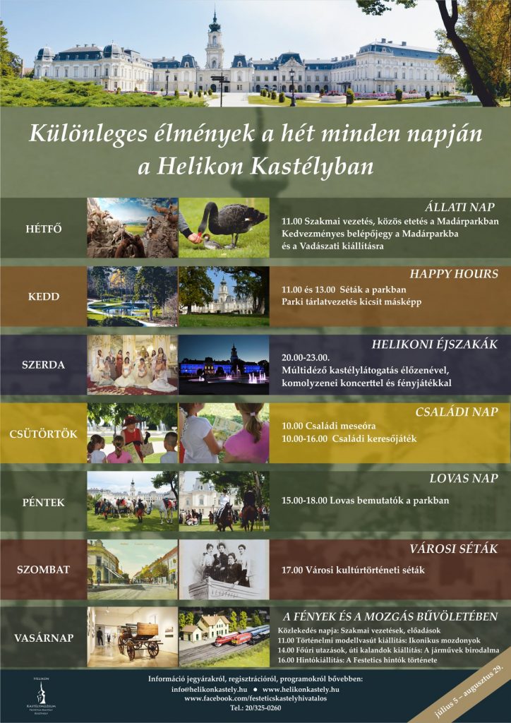 A keszthelyi Helikon Kastélyban július ötödikétől augusztus 29-ig a hét minden napján más programmal várják a vendégeket. Hétfőnként állati nap lesz szakmai vezetéssel, keddenként happy hours címmel tárlatvezetés a parkban, szerdánként Helikoni éjszakák címmel múltidéző kastélylátogatás élőzenével, fényjátékkal, csütörtökönként Családi nap, azaz meseóra és keresőjáték, péntekenként a Lovas napon lovas bemutatók lesznek, szombatonként városi kultúrtörténeti […]