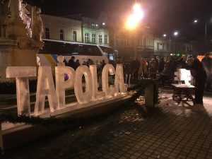 Az ügyes kezű láncfűrészesek idén újra a város nevét formázták meg a hatalmas jégtömbökből. A tavalyi mű csupán néhány napot élt az enyhe tél miatt,