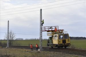 Az MTI fotósa több helyütt is remek képeket készített az észak-balatoni villamosítást végző munkásokról. A mindennapok során autóbuszokkal szállítják az utasokat, mert több helyütt még