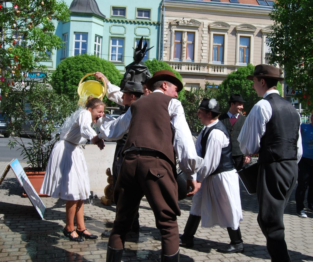 A badacsonytördemici Tördemic Néptáncegyüttes tagjai vödörből locsolták meg a táncos lábú lányokat Tapolcán, Nemesgulácson, Sümegen, Zalahalápon, Sáskán.